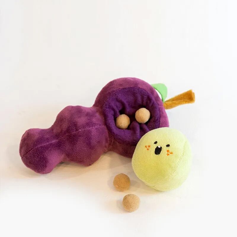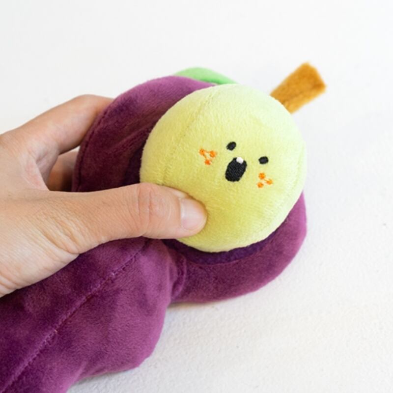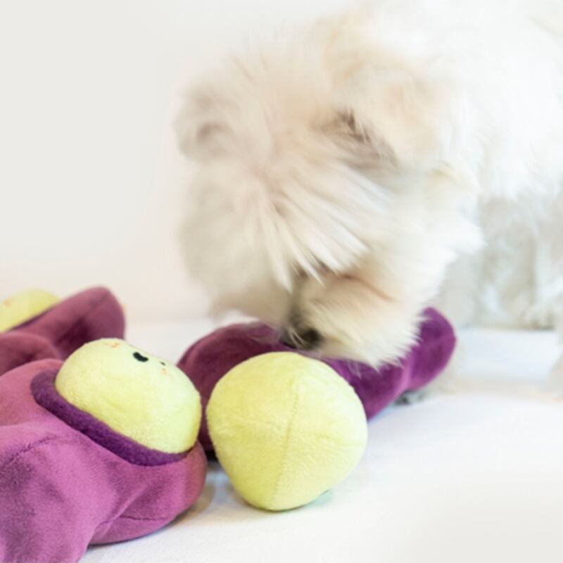 ぶどう ノーズワークトイは、可愛らしい見た目と、簡単に探しやすいデザインが特徴です。ボリュームのある柔らかい生地でできており、ぶどうの粒と本体の下部分に鳴き笛が入っていて、ピッピという音でも楽しく遊べます。ぶどうの粒の横部分を押すとポンと粒が出る仕組みです。本体におやつを隠し、その上にぶどうの粒を入れることでノーズワークトイが完成します。見た目も可愛く、プレゼントにもぴったりです。