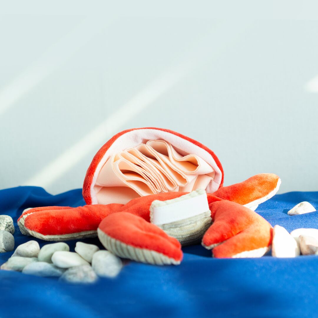 カニ ノーズワークトイは、見た目がとても可愛らしく、本体がシャカシャカと音を鳴らして楽しく遊べるおもちゃです。本体の中には隠されたポケットがあり、そこにおやつを隠して遊ぶことができます。また、マジックテープが付いているため、愛犬に合わせて難易度を調整することが可能です。