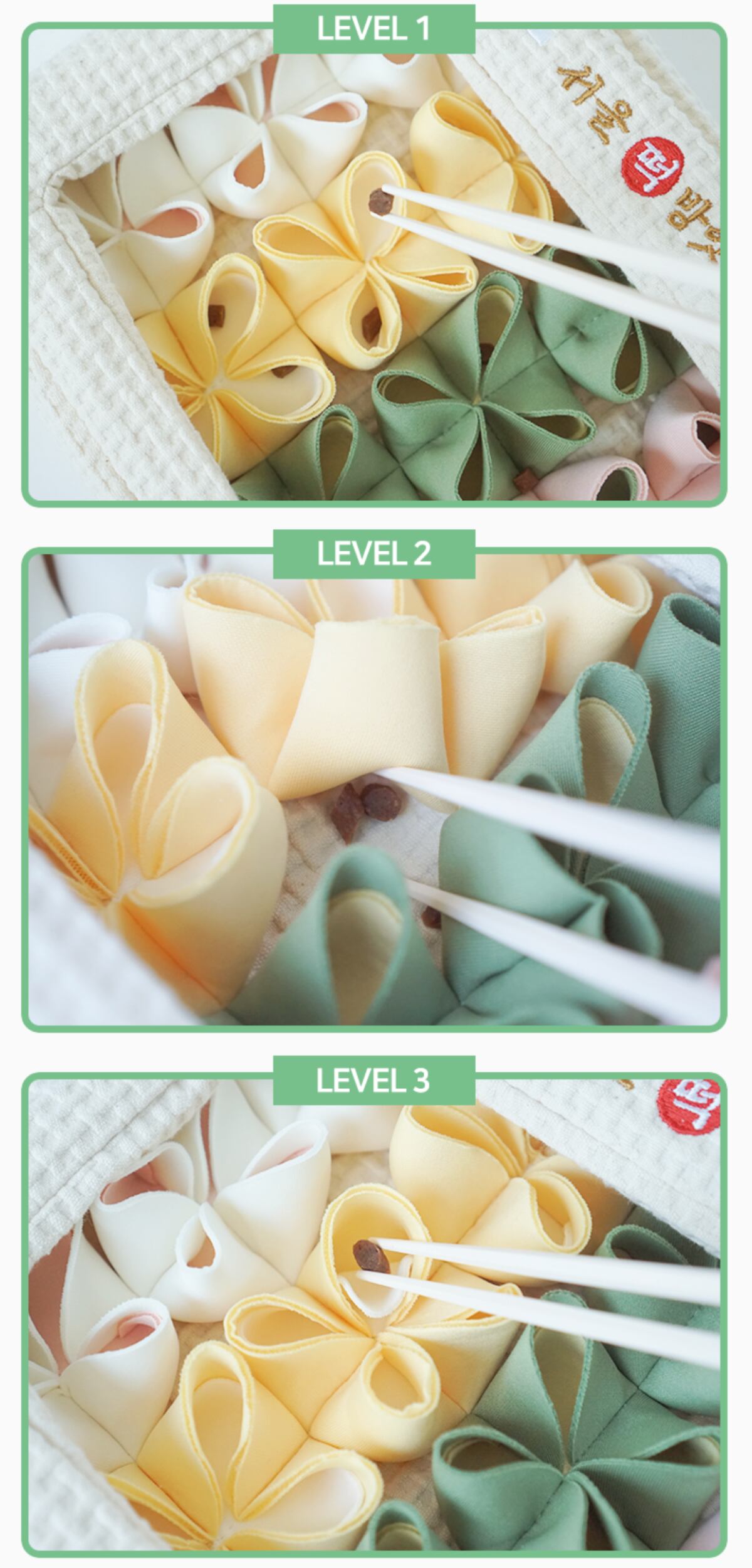 簡単すぎない絶妙なバランスでノーズワークデビューの子も、慣れている子も、飽きずに長く遊べます。