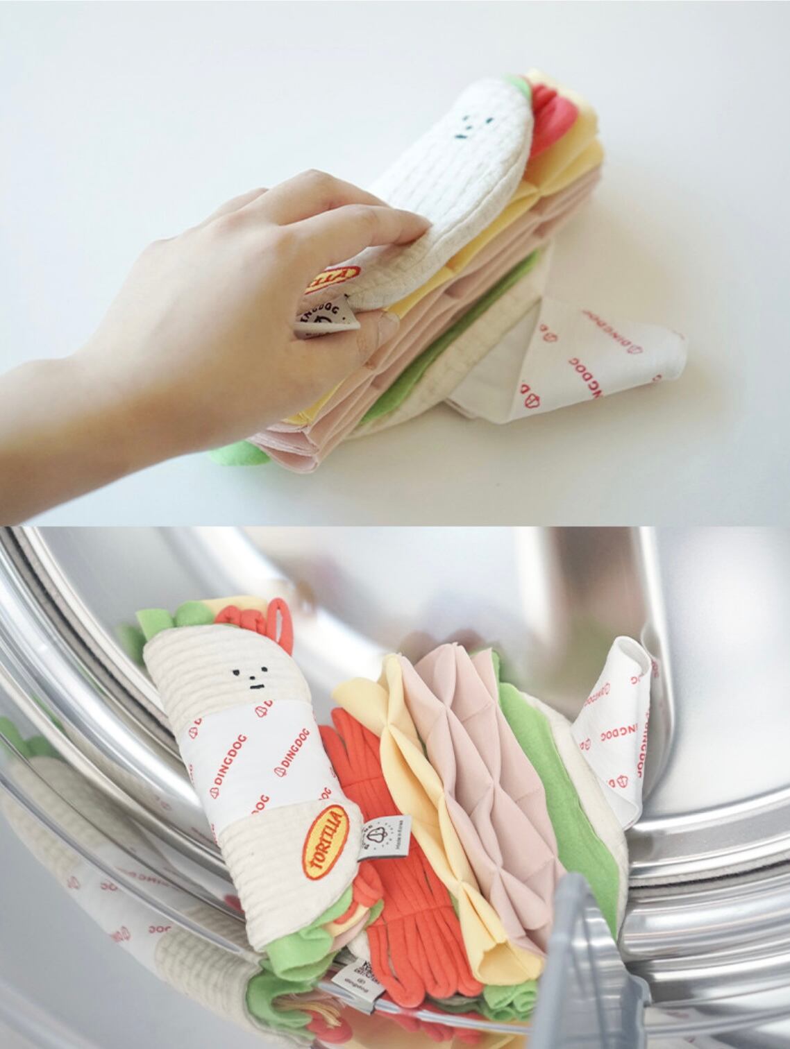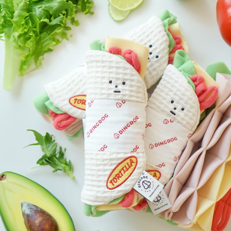 トルティーヤの生地は、水着にも使用される素材を使用しており、よだれが乾きやすく埃がつきにくいです。