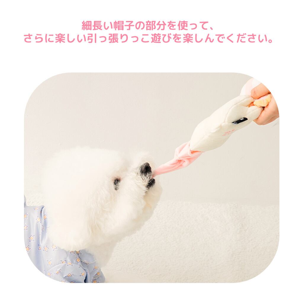 細長い帽子の部分を使って、 さらに楽しい引っ張りっこ遊びを楽しんでください。
